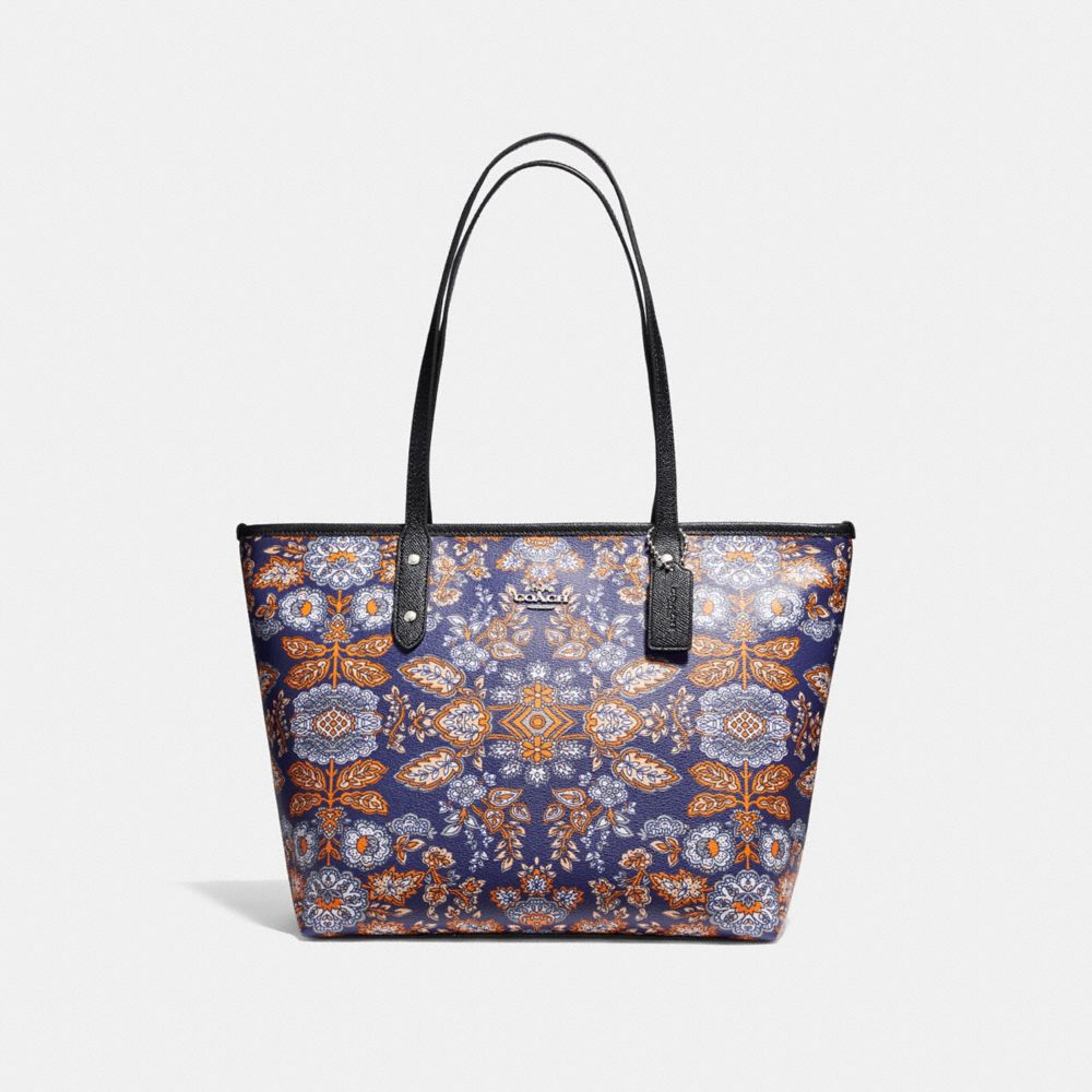 1. COACH f11823 - CITY ZIP TOTE IN FOREST FLOWER PRINT COATED CANVAS - SILVER/BLUE