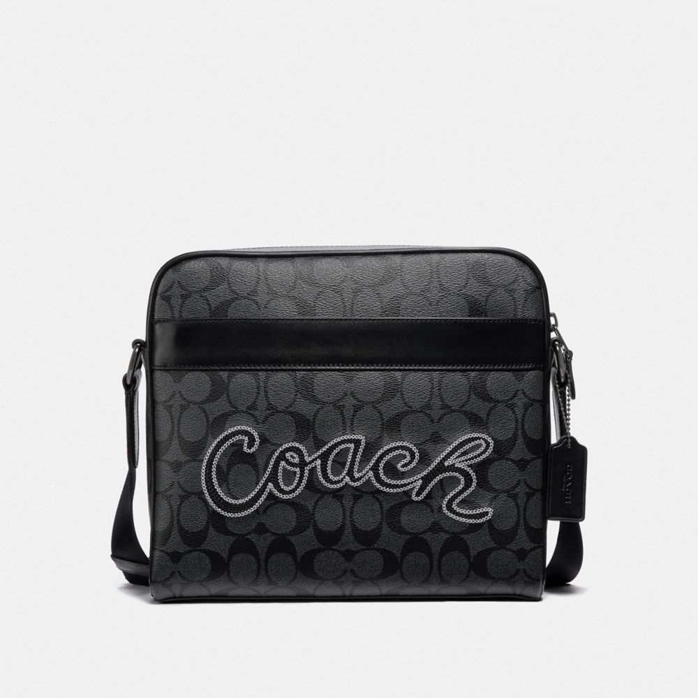 1. COACH F37558 - CHARLES CAMERA BAG IN SIGNATURE CANVAS WITH COACH SCRIPT - CHARCOAL/BLACK/BLACK ANTIQUE NICKEL